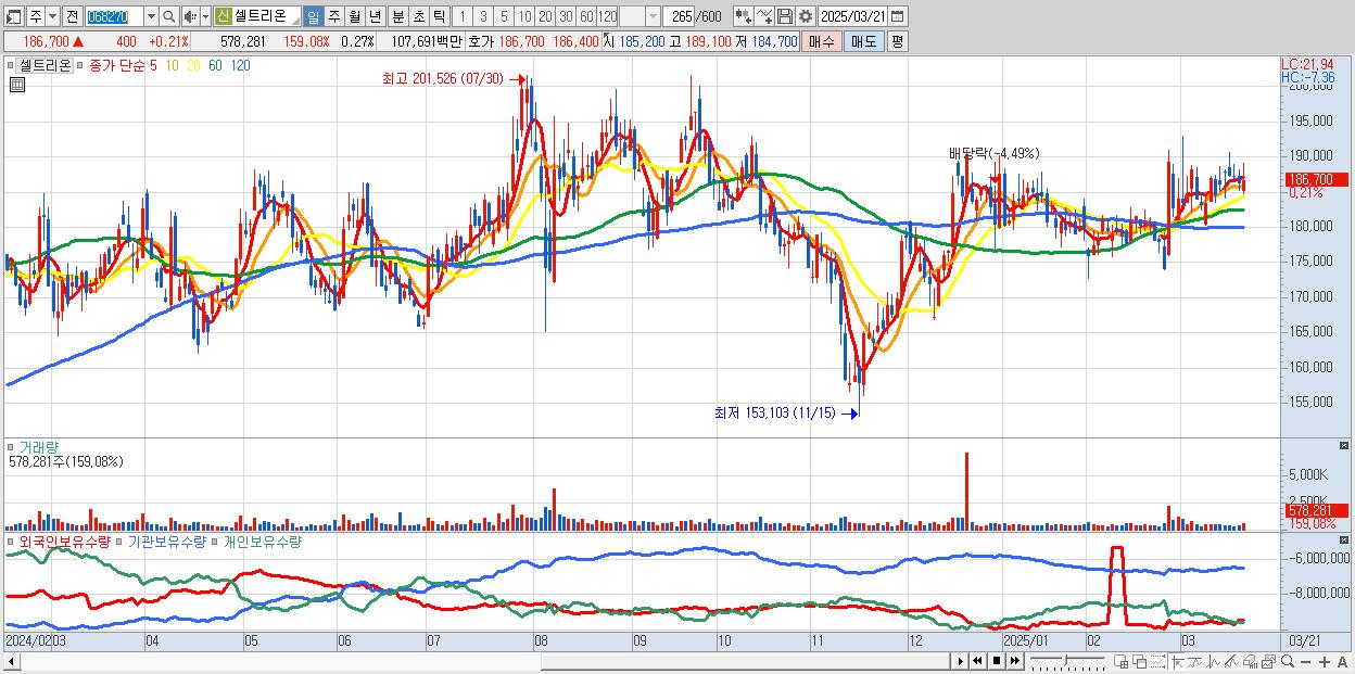 - 셀트리온 (186,700원 ▲ 0.21% , 시총: 399,740억, 외국인 순매수 거래금:65억)