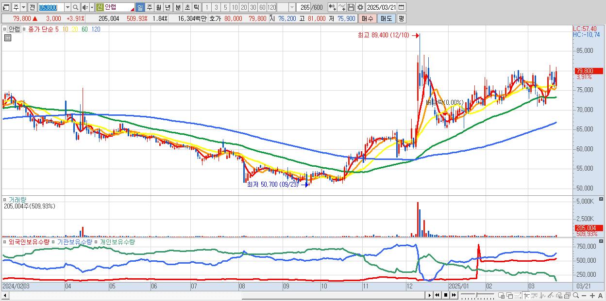 - 안랩 (80,000원 ▲ 4.17% , 시총: 8,901억, 외국인 순매수 거래금:60억)