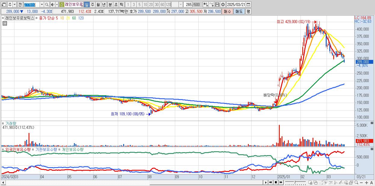 - 레인보우로보틱스 (289,000원 ▼ -4.3% , 시총: 56,066억, 외국인 순매수 거래금:121억)