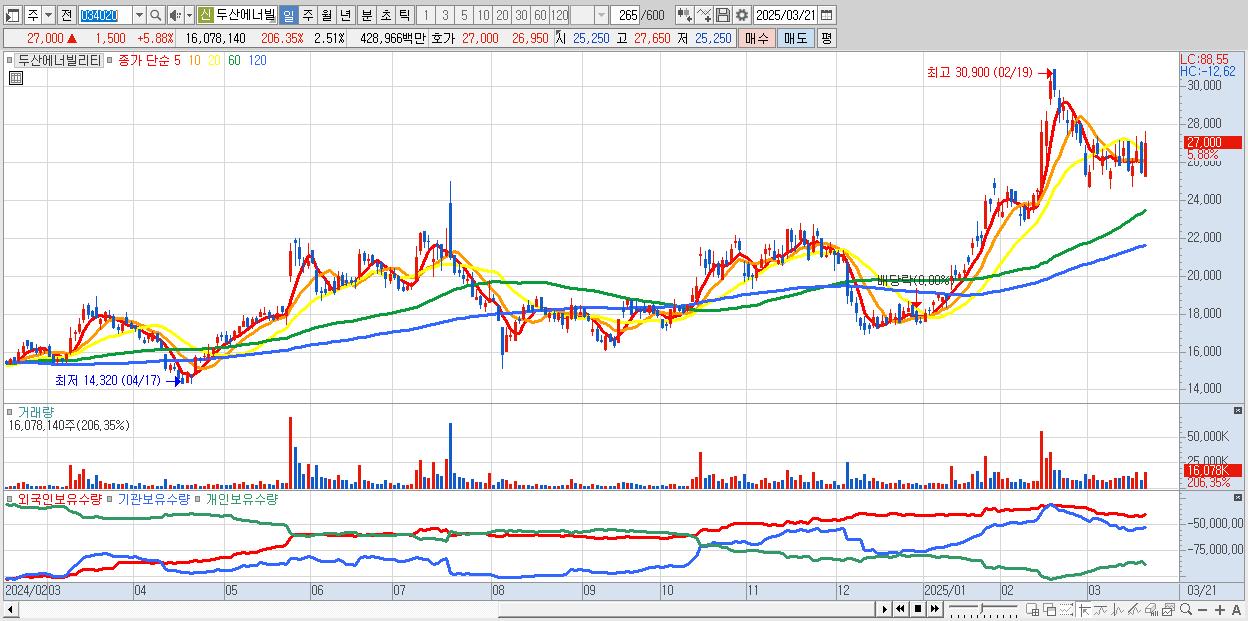 - 두산에너빌리티 (27,000원 ▲ 5.88% , 시총: 172,952억, 외국인 순매수 거래금:433억)