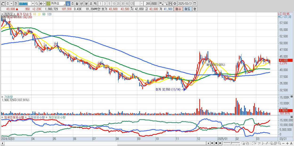 - 카카오 (43,600원 ▲ 2.23% , 시총: 193,462억, 외국인 순매수 거래금:166억)