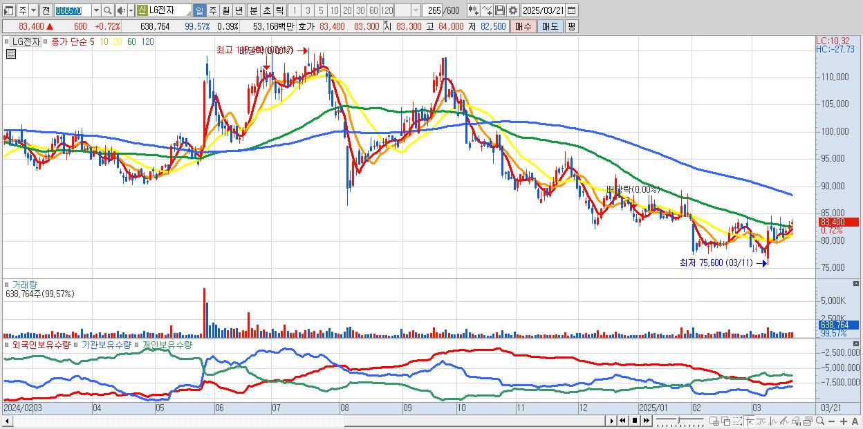 - LG전자 (83,400원 ▲ 0.72% , 시총: 136,482억, 외국인 순매수 거래금:69억)
