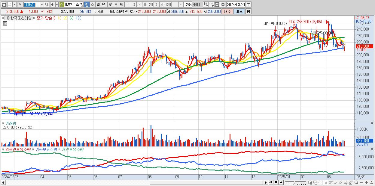 - HD한국조선해양 (213,500원 ▲ 1.91% , 시총: 151,101억, 외국인 순매수 거래금:133억)