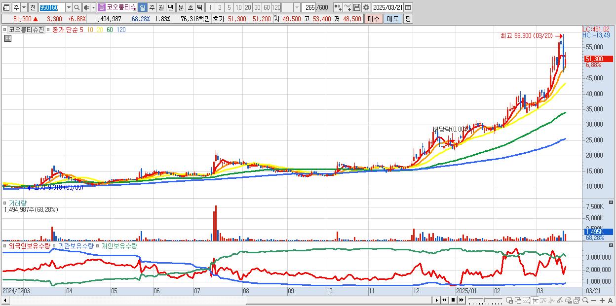 - 코오롱티슈진 (51,300원 ▲ 6.88% , 시총: 41,822억, 외국인 순매수 거래금:69억)