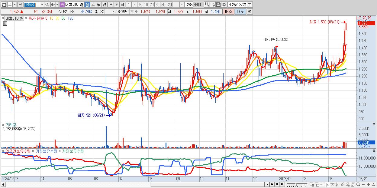 - 대호에이엘 (1,573원 ▲ 3.35% , 시총: 1,067억, 거래량: 2,052,068, 거래대금:32억, KOSPI)