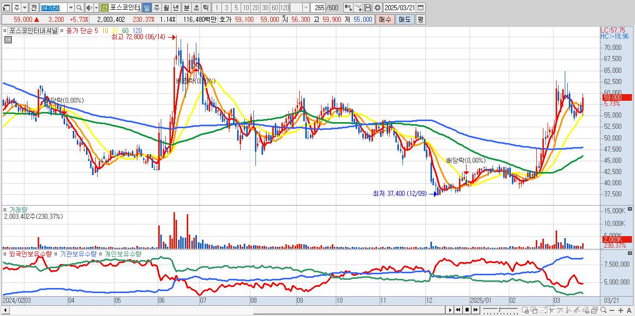 - 포스코인터내셔널 (59,000원 ▲ 5.73% , 시총: 103,794억, 거래량: 2,003,402, 거래대금:1,165억)
