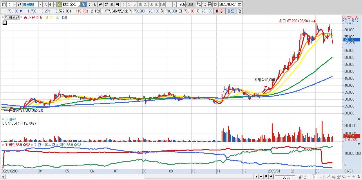 - 한화오션 (73,100원 ▼ -2.27% , 시총: 223,988억, 거래량: 6,577,804, 거래대금:4,775억)