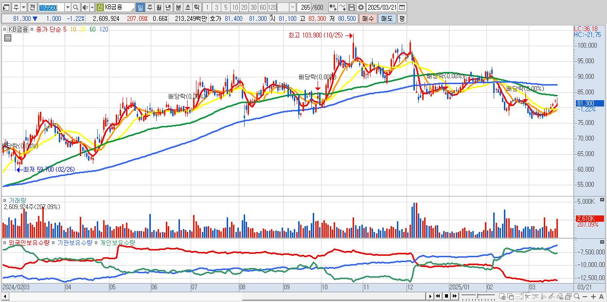 - KB금융 (81,300원 ▼ -1.22% , 시총: 319,939억, 거래량: 2,609,924, 거래대금:2,132억)