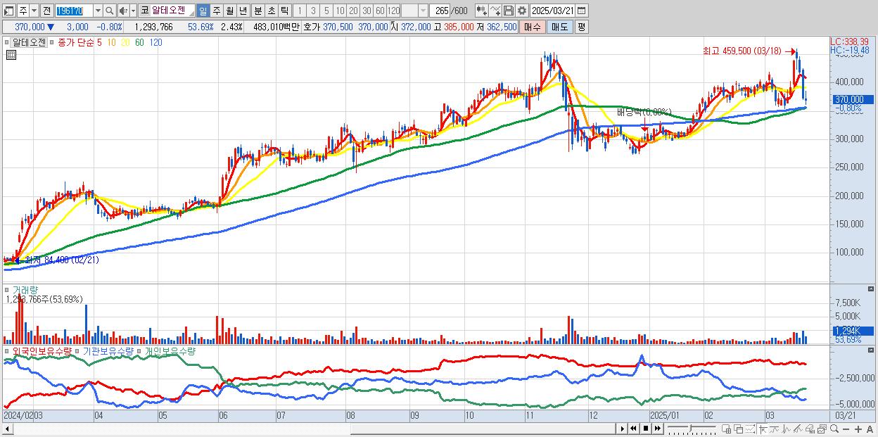 - 알테오젠 (370,000원 ▼ -0.8% , 시총: 197,280억, 거래량: 1,293,766, 거래대금:4,830억)