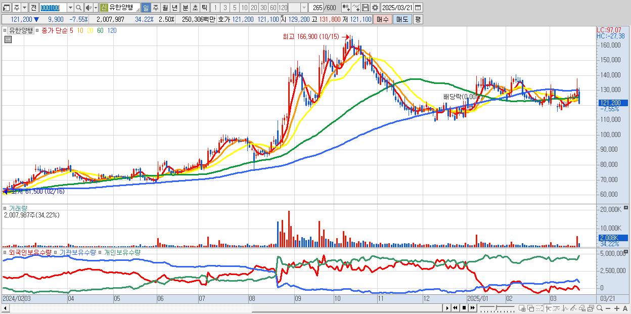 - 유한양행 (121,200원 ▼ -7.55% , 시총: 97,213억, 거래량: 2,007,987, 거래대금:2,503억)
