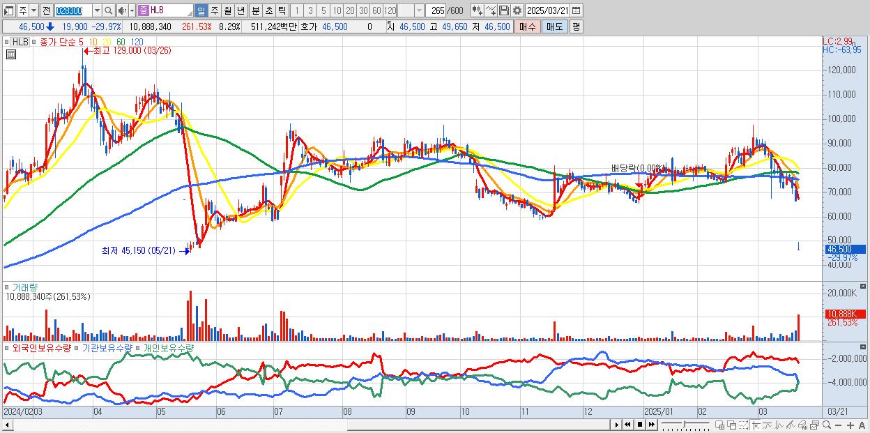 - HLB (46,500원 ▼ -29.97% , 시총: 61,095억, 거래량: 10,888,340, 거래대금:5,112억)