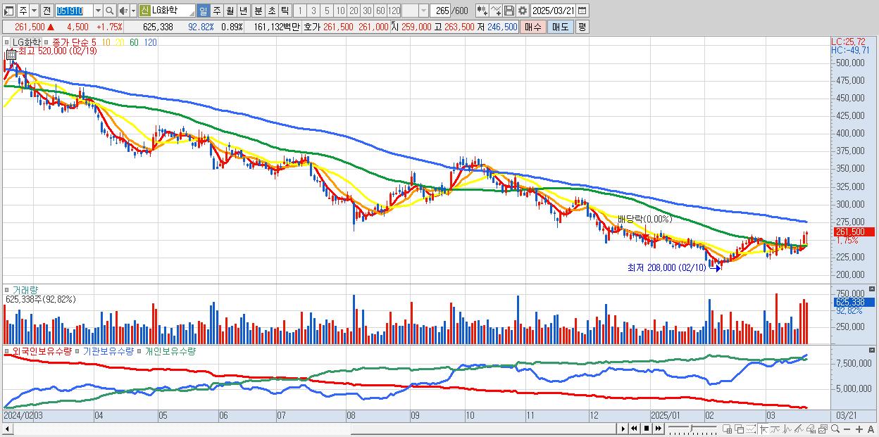 - LG화학 (261,500원 ▲ 1.75% , 시총: 184,599억, 거래량: 625,338, 거래대금:1,611억)
