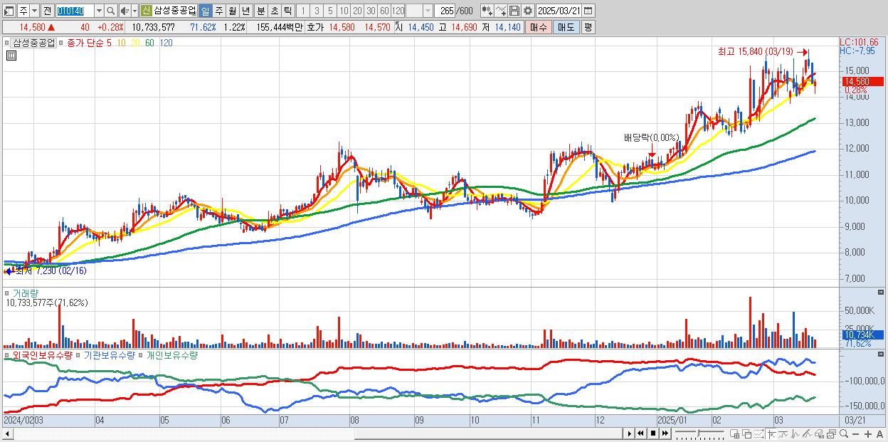 - 삼성중공업 (14,580원 ▲ 0.28% , 시총: 128,304억, 거래량: 10,733,577, 거래대금:1,554억)