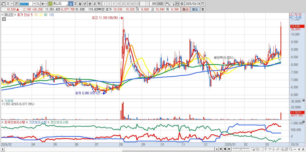 - 휴니드 (10,530원 ▲ 26.26% , 시총: 1,486억, 거래량: 11,551,429, 거래대금:1,198억)