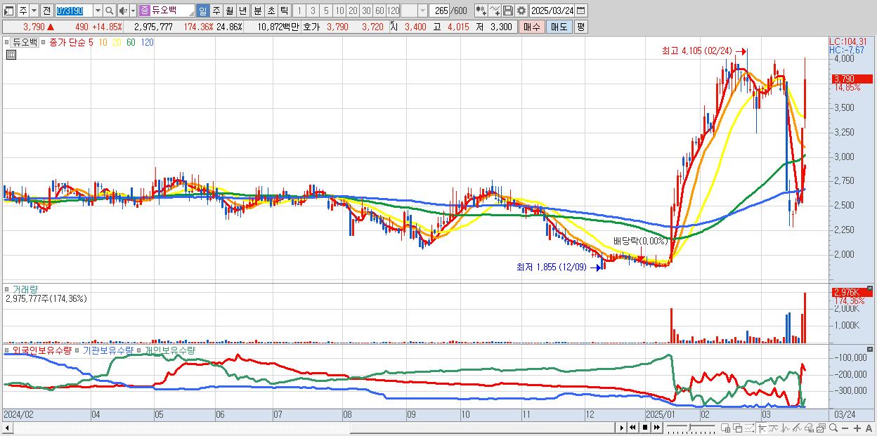 - 듀오백 (3,790원 ▲ 14.85% , 시총: 454억, 거래량: 2,975,777, 거래대금:109억)