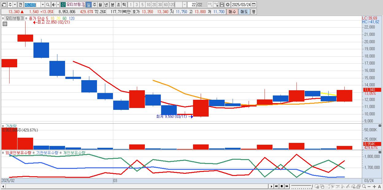 - 모티브링크 (13,340원 ▲ 13.05% , 시총: 1,653억, 거래량: 8,953,806, 거래대금:1,177억)