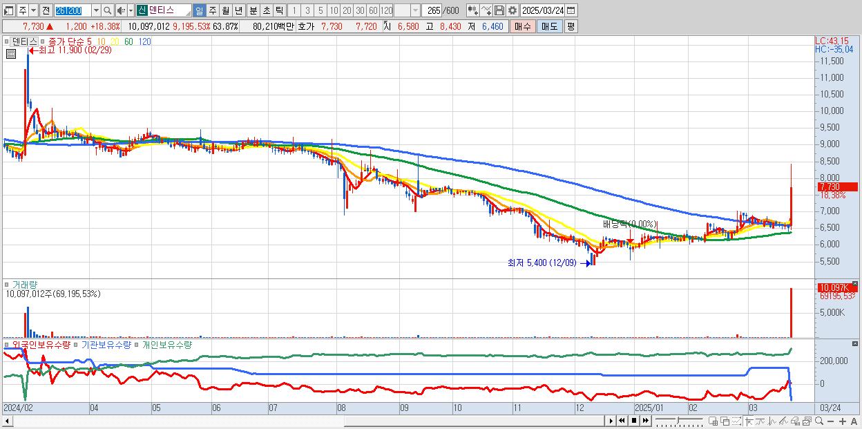 - 덴티스 (7,730원 ▲ 18.38% , 시총: 1,222억, 거래량: 10,097,012, 거래대금:802억)