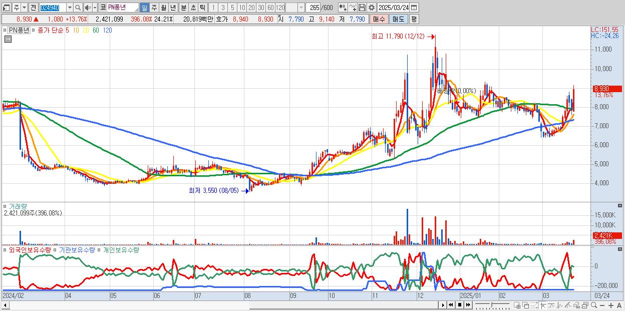 - PN풍년 (8,930원 ▲ 13.76% , 시총: 893억, 거래량: 2,421,099, 거래대금:208억)