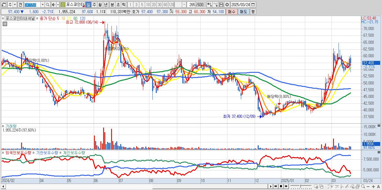 - 포스코인터내셔널 (57,200원 ▼ -3.05% , 시총: 100,628억, 거래량: 1,360,740, 거래대금:767억)