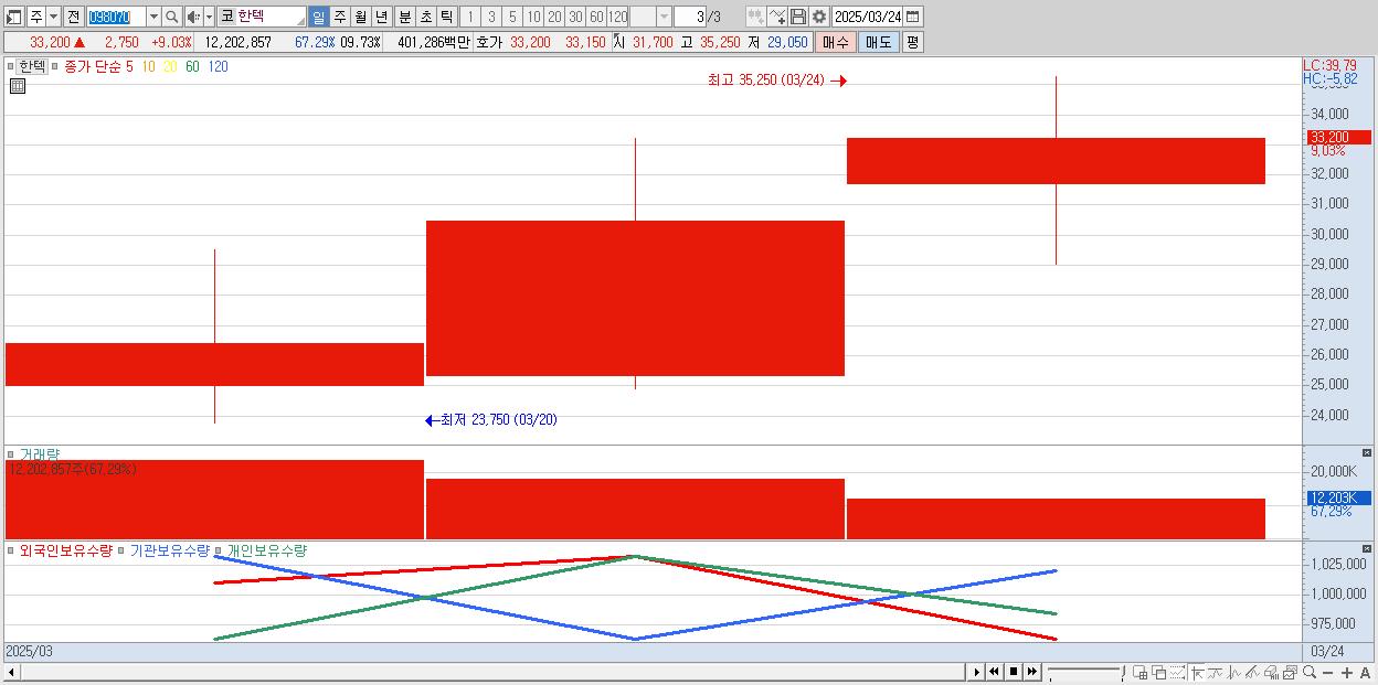 - 한텍 (33,200원 ▲ 9.03% , 시총: 3,692억, 거래량: 12,202,857, 거래대금:4,013억)