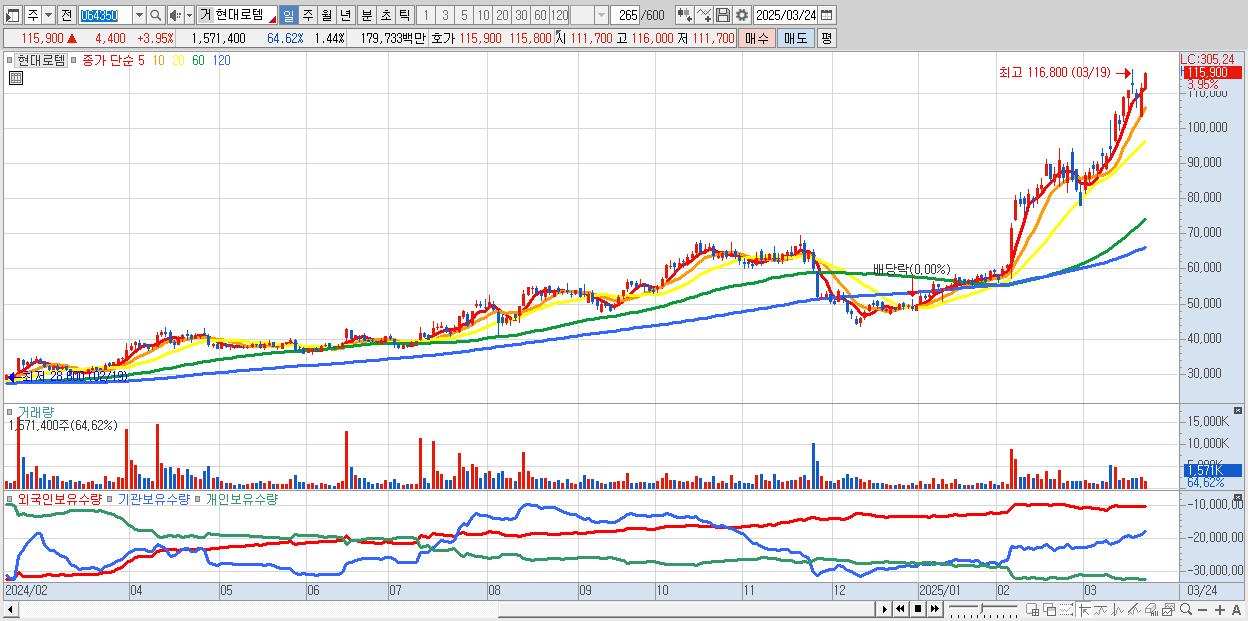 - 현대로템 (115,700원 ▲ 3.77% , 시총: 126,278억, 거래량: 1,240,235, 거래대금:1,418억)