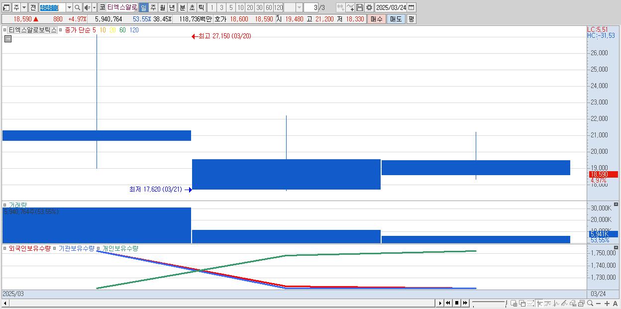 - 티엑스알로보틱스 (18,590원 ▲ 4.97% , 시총: 2,872억, 거래량: 5,940,764, 거래대금:1,187억)