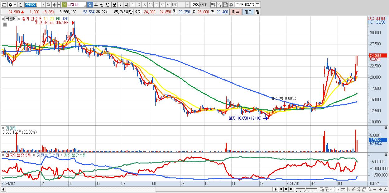 - 티엘비 (24,900원 ▲ 8.26% , 시총: 2,448억, 거래량: 3,566,132, 거래대금:857억)
