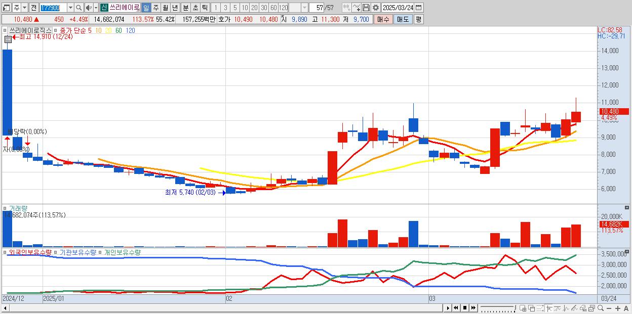 - 쓰리에이로직스 (10,480원 ▲ 4.49% , 시총: 990억, 거래량: 14,682,074, 거래대금:1,573억)