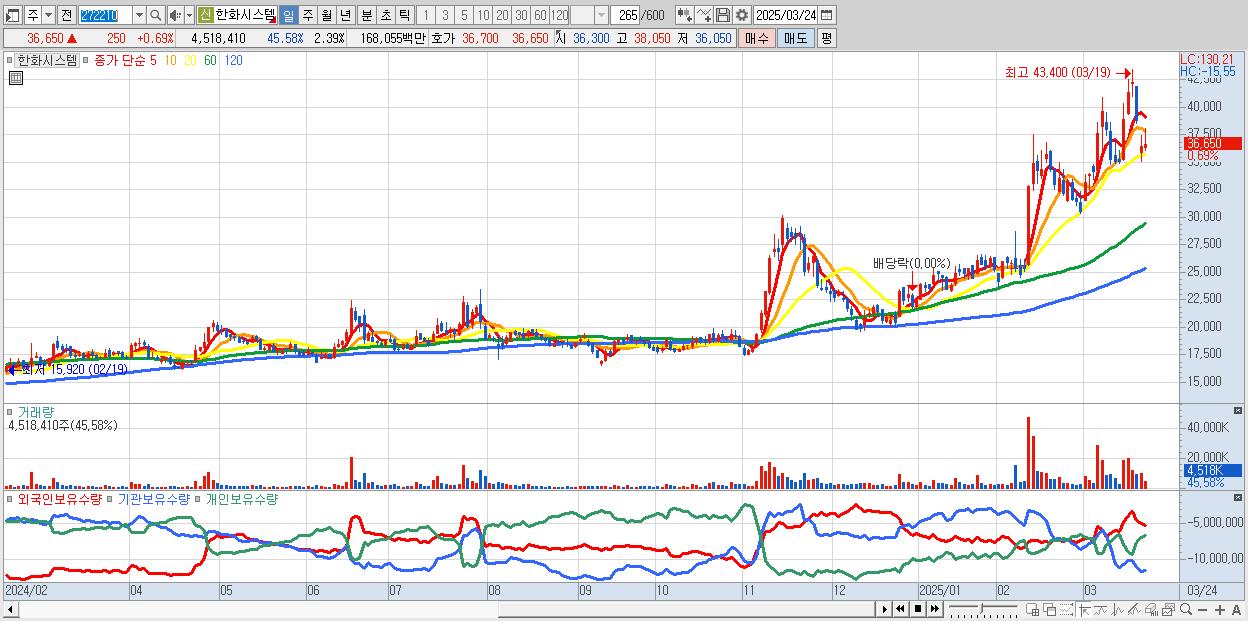 - 한화시스템 (36,850원 ▲ 1.24% , 시총: 69,617억, 거래량: 3,067,951, 거래대금:1,142억)
