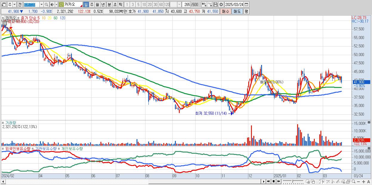 - 카카오 (41,900원 ▼ -3.9% , 시총: 185,919억, 거래량: 1,792,693, 거래대금:757억)