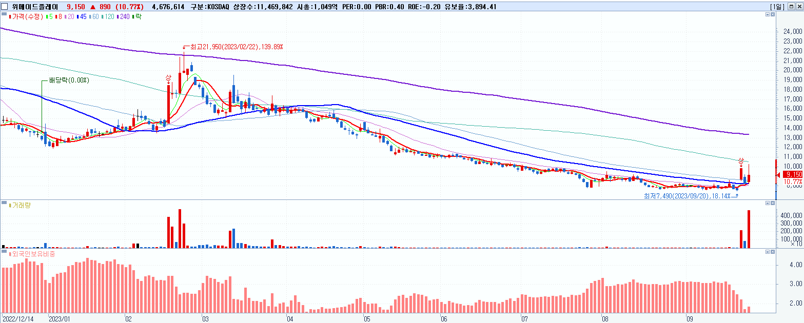 - 위메이드플레이 (9,150원 ▲ 10.77% , 시총: 1,049억, 거래량: 4,676,614, 거래대금:448억)
