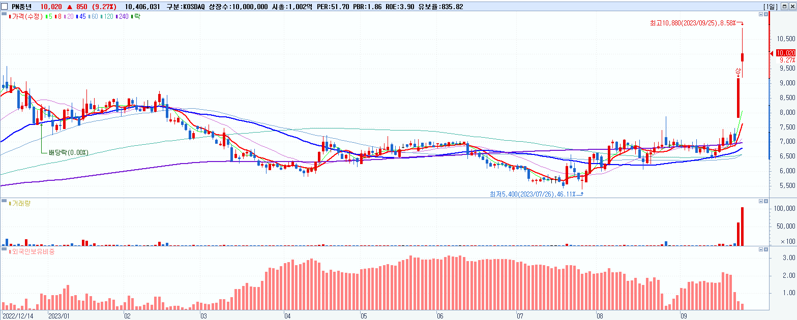 - PN풍년 (10,020원 ▲ 9.27% , 시총: 1,002억, 거래량: 10,406,031, 거래대금:1,065억)