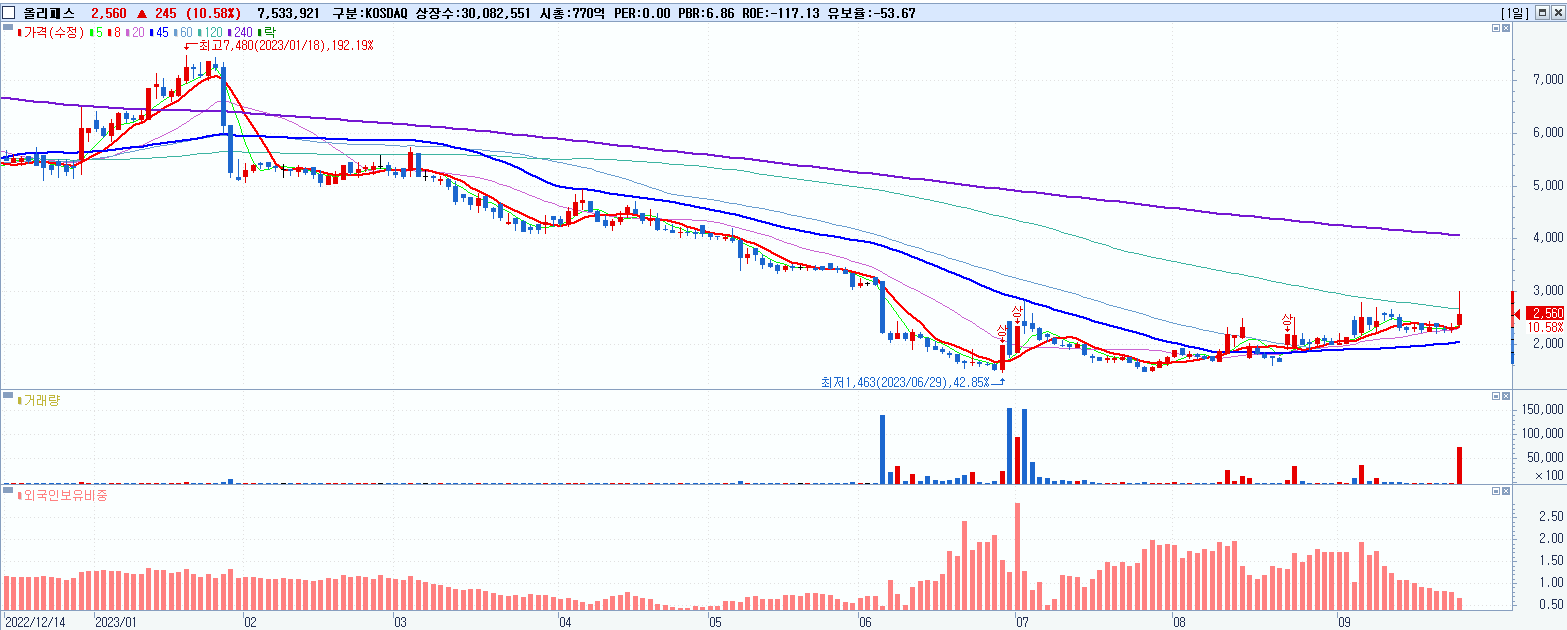 - 올리패스 (2,560원 ▲ 10.58% , 시총: 770억, 거래량: 7,533,921, 거래대금:217억)