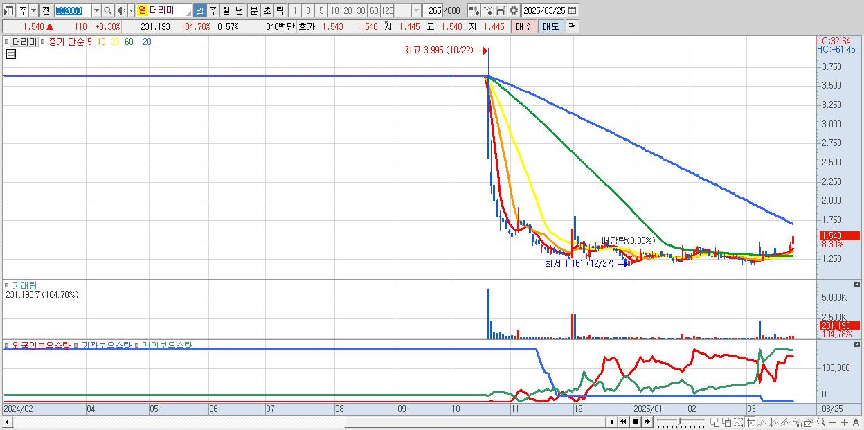 - 더라미 (1,540원 ▲ 8.3% , 시총: 622억, 거래량: 231,193, 거래대금:3억)