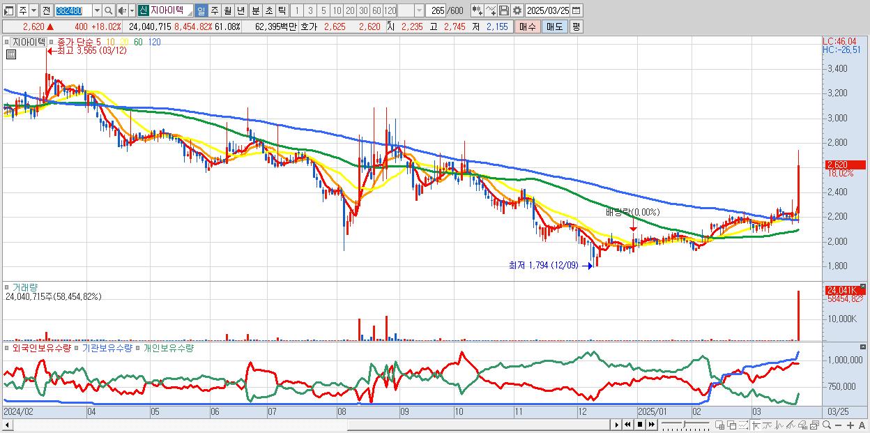 - 지아이텍 (2,620원 ▲ 18.02% , 시총: 1,031억, 거래량: 24,040,715, 거래대금:624억)