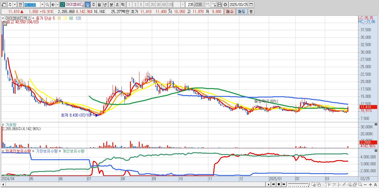 - 아이엠비디엑스 (11,410원 ▲ 16.91% , 시총: 1,599억, 거래량: 2,265,868, 거래대금:254억)