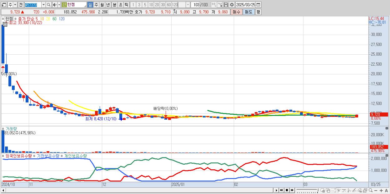 - 한켐 (9,720원 ▲ 8% , 시총: 780억, 거래량: 183,052, 거래대금:17억)