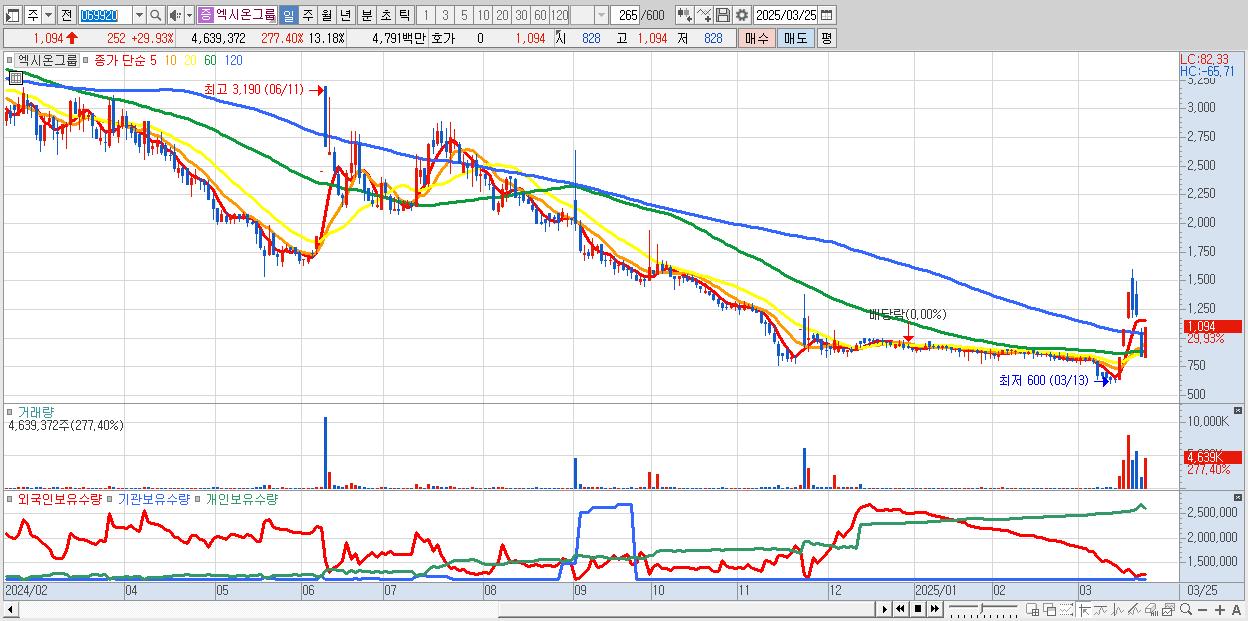 - 엑시온그룹 (1,094원 ▲ 29.93% , 시총: 385억, 거래량: 4,639,372, 거래대금:48억)