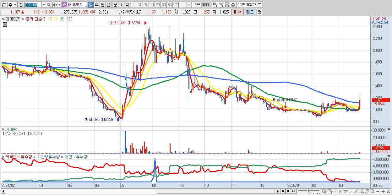 - 애머릿지 (1,167원 ▲ 13.85% , 시총: 515억, 거래량: 1,275,335, 거래대금:15억)