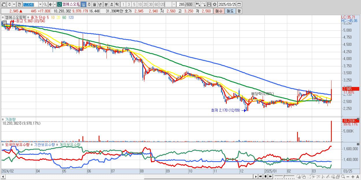 - 엠에스오토텍 (2,945원 ▲ 17.8% , 시총: 1,844억, 거래량: 10,293,382, 거래대금:314억)