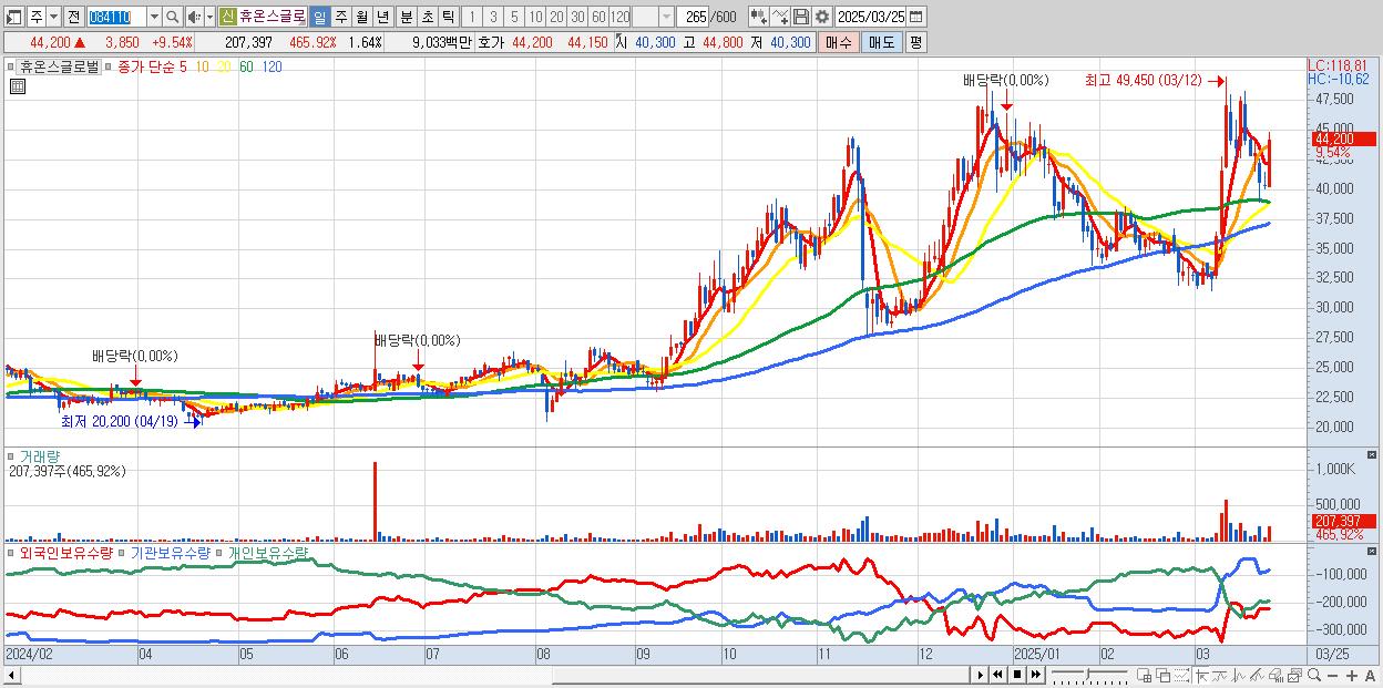 - 휴온스글로벌 (44,200원 ▲ 9.54% , 시총: 5,585억, 거래량: 207,397, 거래대금:90억)
