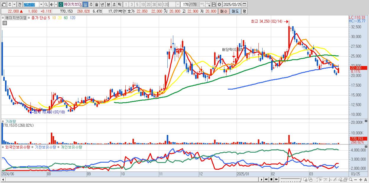 - 에이치브이엠 (22,000원 ▲ 8.11% , 시총: 2,618억, 거래량: 770,153, 거래대금:171억)
