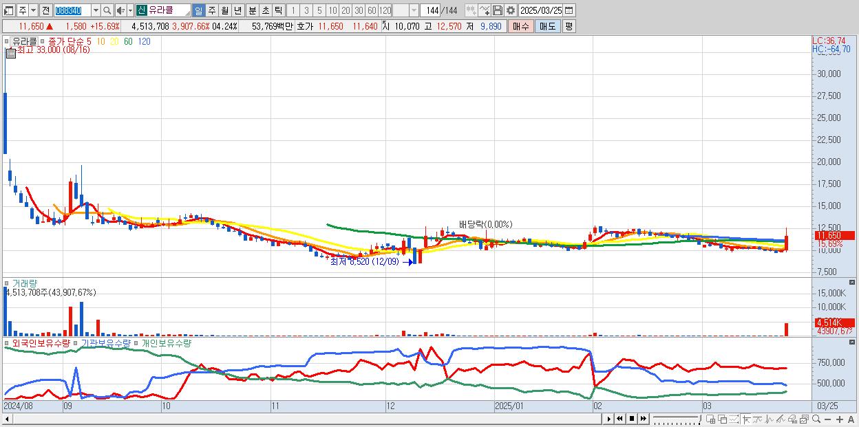 - 유라클 (11,650원 ▲ 15.69% , 시총: 504억, 거래량: 4,513,708, 거래대금:538억)