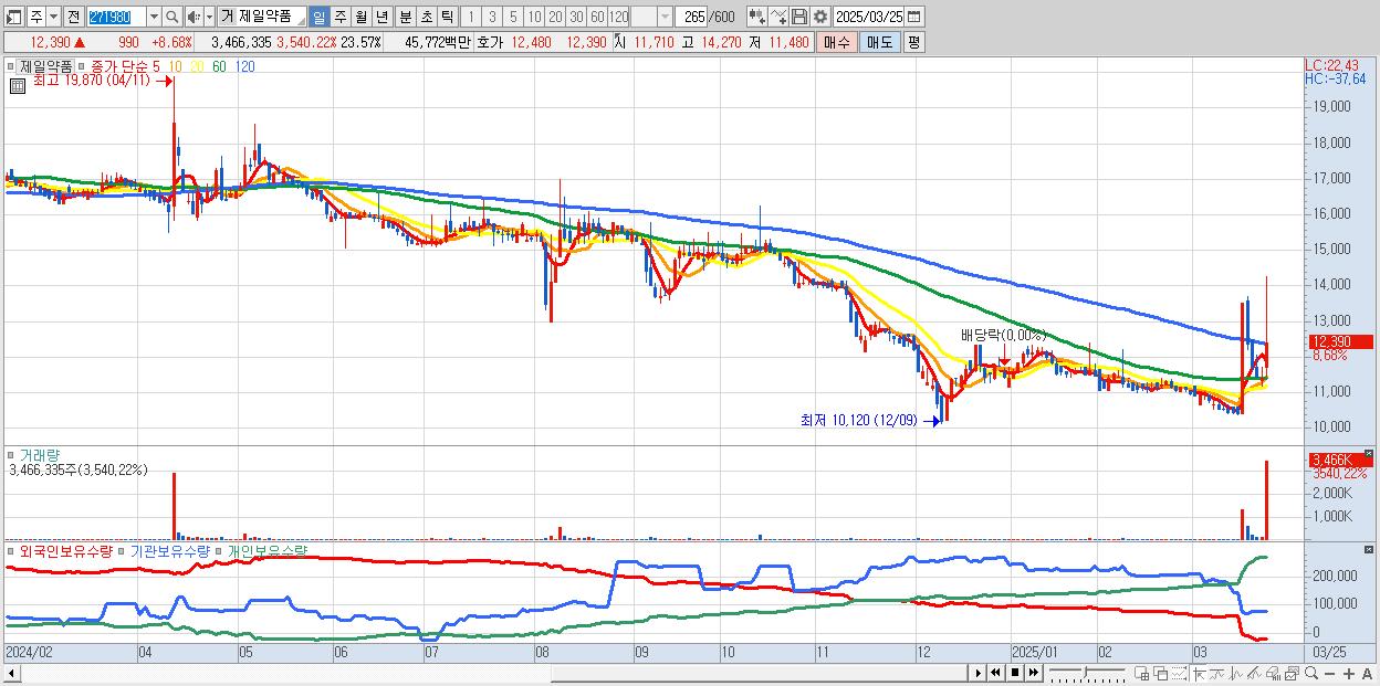 - 제일약품 (12,390원 ▲ 8.68% , 시총: 1,822억, 거래량: 3,466,335, 거래대금:458억)