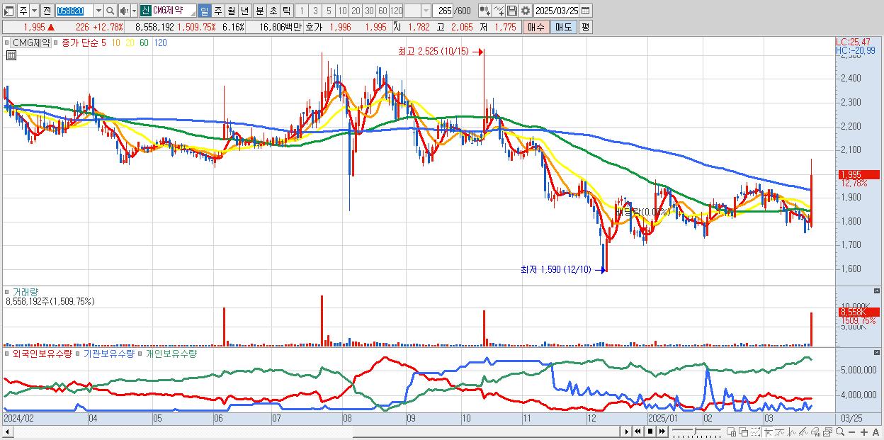 - CMG제약 (1,995원 ▲ 12.78% , 시총: 2,771억, 거래량: 8,558,192, 거래대금:168억)