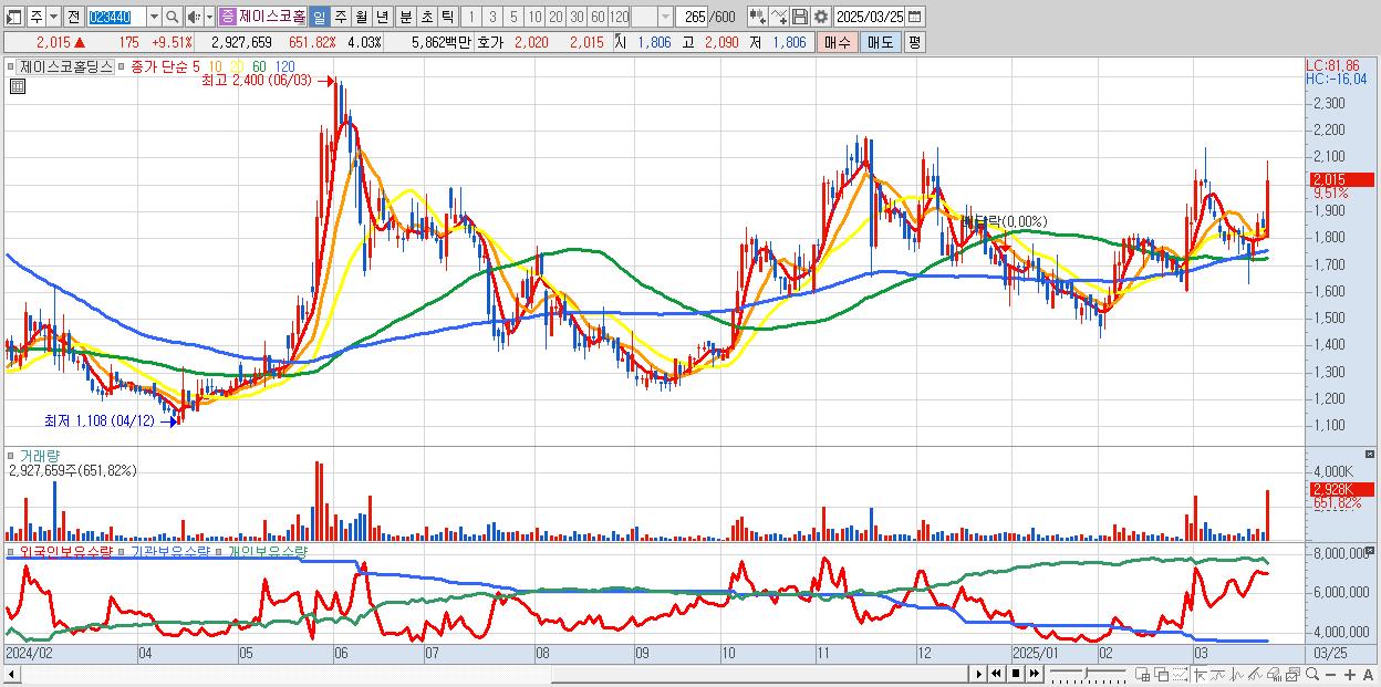 - 제이스코홀딩스 (2,015원 ▲ 9.51% , 시총: 1,465억, 거래량: 2,927,659, 거래대금:59억)