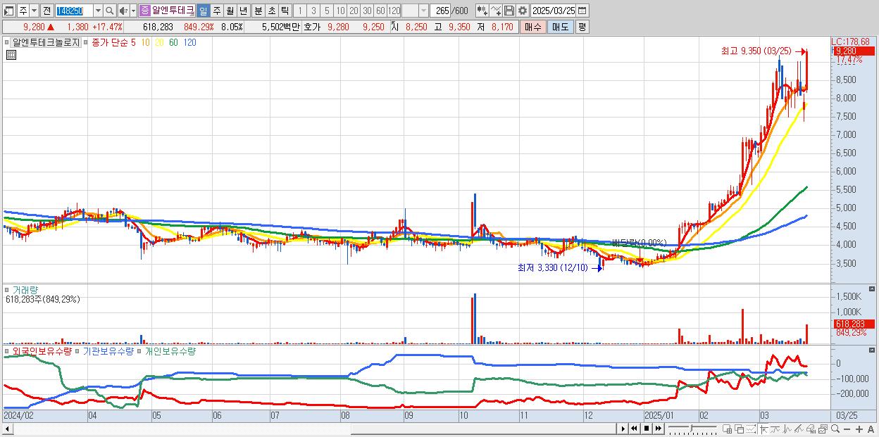 - 알엔투테크놀로지 (9,280원 ▲ 17.47% , 시총: 713억, 거래량: 618,283, 거래대금:55억)
