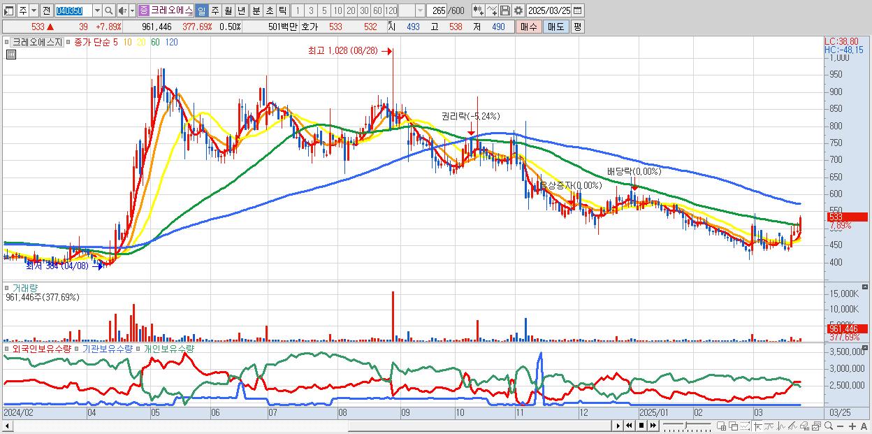 - 크레오에스지 (533원 ▲ 7.89% , 시총: 1,030억, 거래량: 961,446, 거래대금:5억)