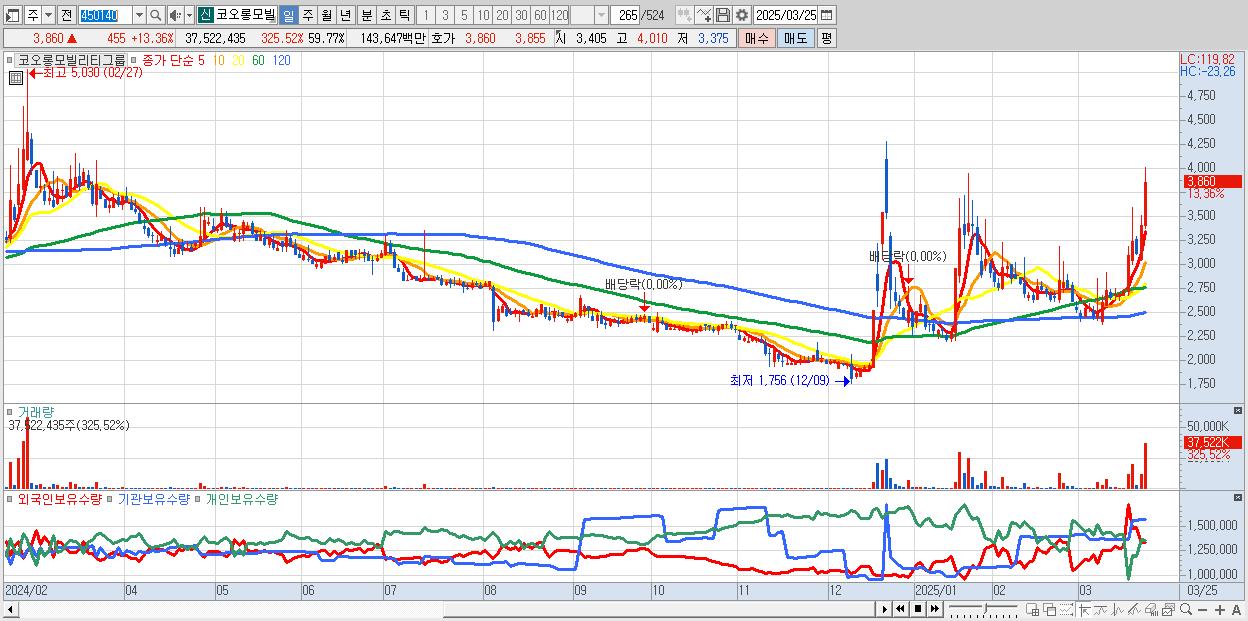 - 코오롱모빌리티그룹 (3,860원 ▲ 13.36% , 시총: 2,423억, 거래량: 37,522,435, 거래대금:1,436억)
