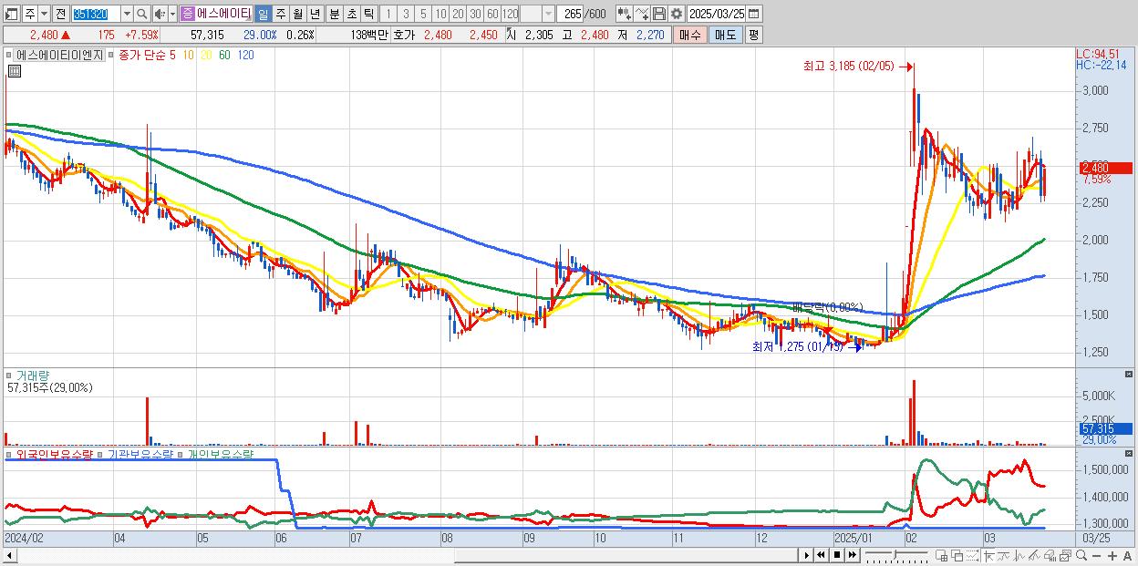 - 에스에이티이엔지 (2,480원 ▲ 7.59% , 시총: 546억, 거래량: 57,315, 거래대금:1억)